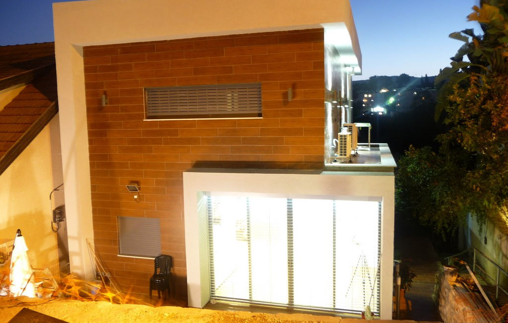 חזיתות הבית צופו ברובן באריחי גרניט פורצלן לכיסוי הפאנל המבודד המרכיב את קירות החוץ.